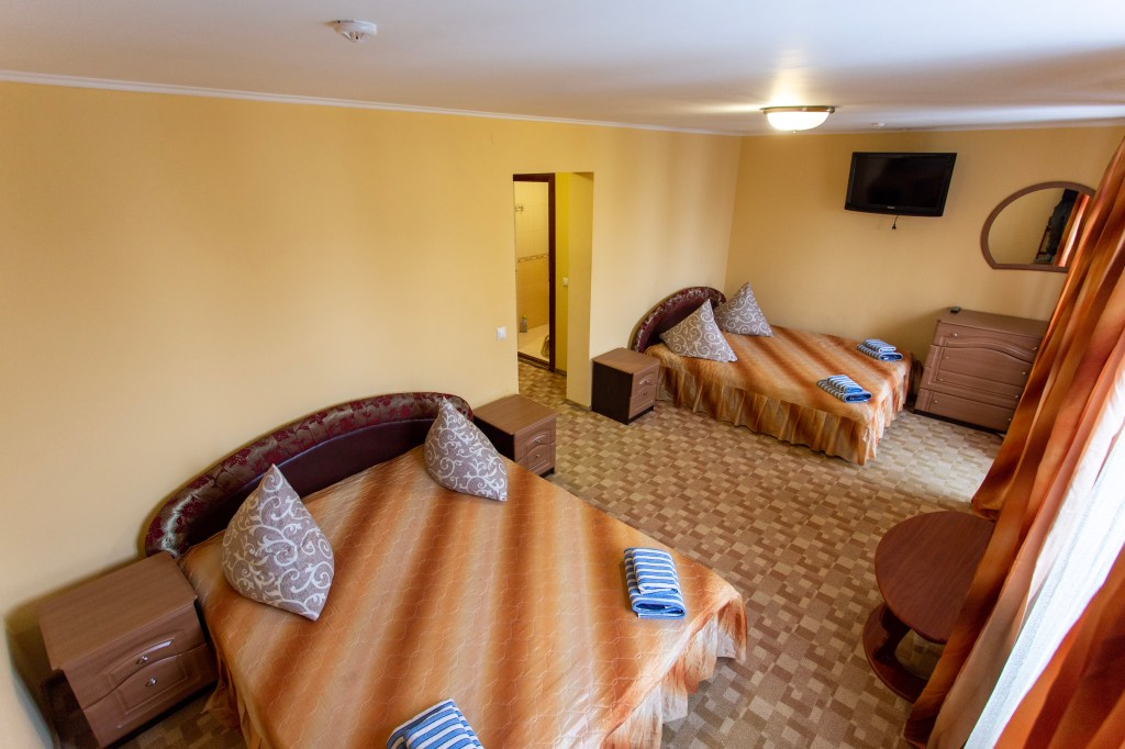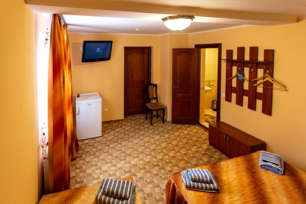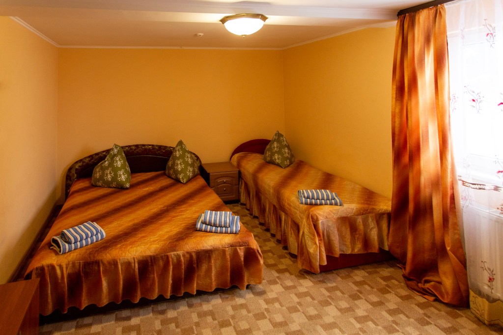 Тримісні однокімнатні номери оснащені двоспальним і односпальним ліжками або трьома односпальними ліжками, супутниковим ТБ, холодильником, телефоном, Wi-Fi, набором меблів, ванною кімнатою (душова кабінка, умивальник, туалет). Номер розрахований на 3 основних місця.