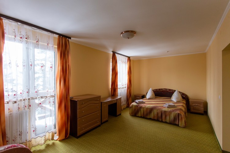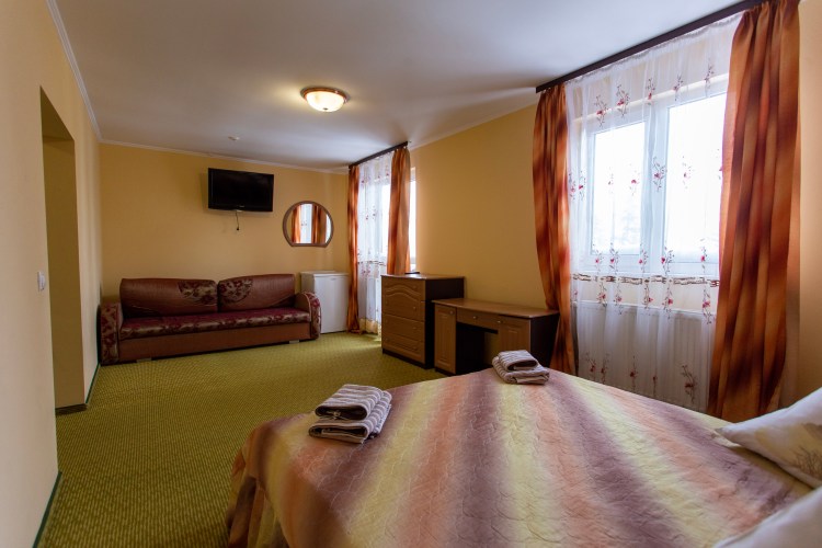 В номері напівлюкс гостям надається двоспальне ліжко матрацом, супутникове ТБ, холодильник, телефон, Wi-Fi, набір меблів, ванну кімнату (душова кабінка, умивальник, туалет). Номер розрахований на 2 основних місця.